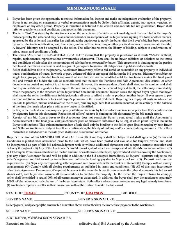 - Memorandum of Sale: To be signed at bid award.