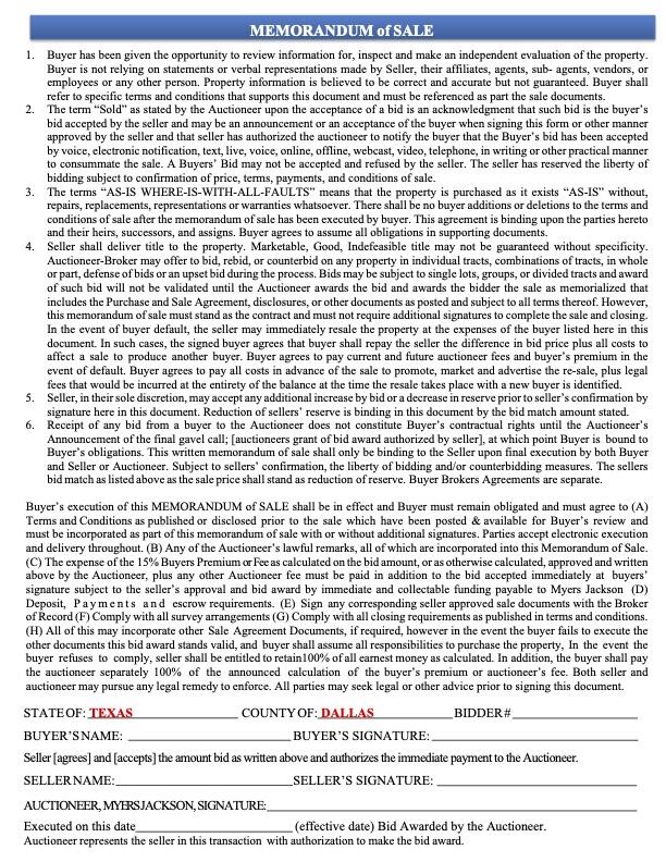 - Memorandum of Sale: To be signed at bid award.