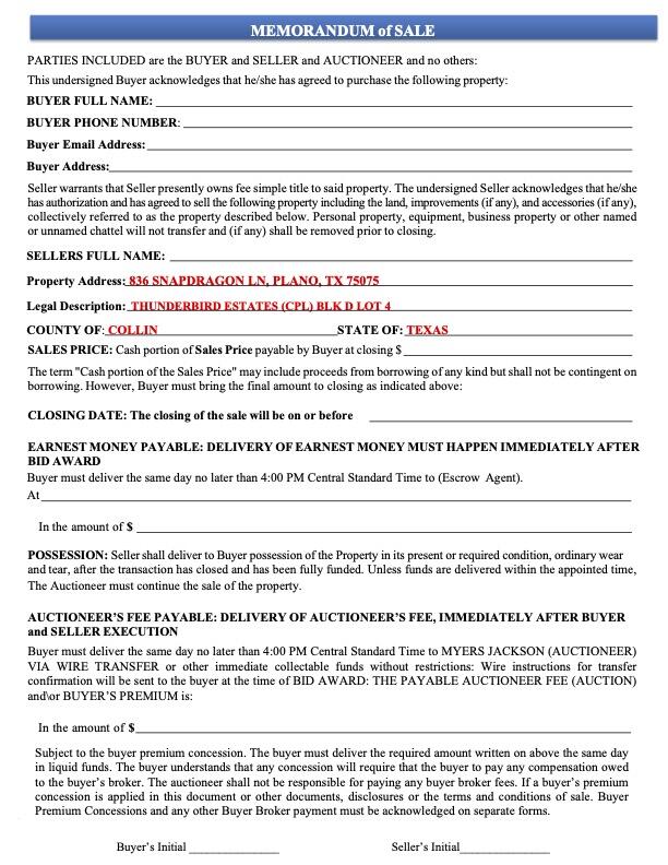 - Memorandum of Sale: To be signed at bid award.
